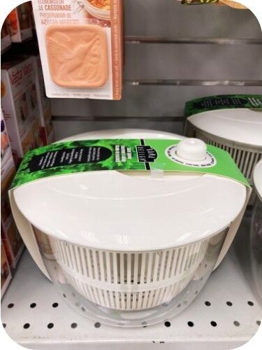 This salad spinner was found at Dollarama for the princely sum of five bucks. I actually bought one and I gotta say, it works a treat. It’s made of sturdy plastic and is very easy to use.