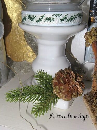 Dress any candle stand for the holidays by hot gluing a faux pine piece and pinecone to the base.