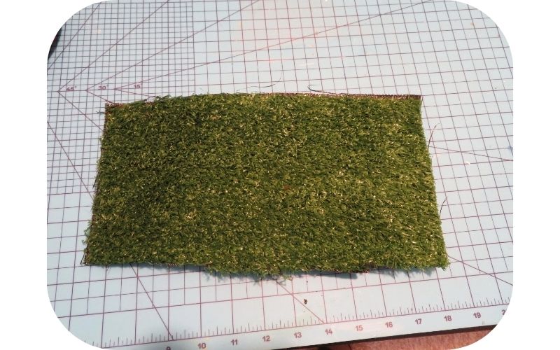 After pondering what to do with this piece, I decided to first cover it in some faux grass. This is a piece of grass tile I’ve had in my stash for some time.
