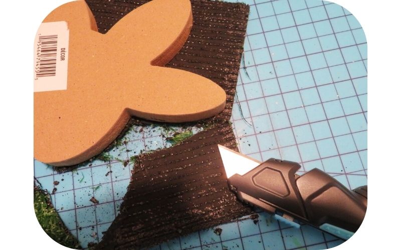 After hot gluing the faux grass to the shape, I used my utility knife to trim around the edges. These grass tiles would be tough to cut through using ordinary scissors or an X-acto knife, although I did use the smaller blade to reach into some of the crevices after the bulk of the material had been removed.