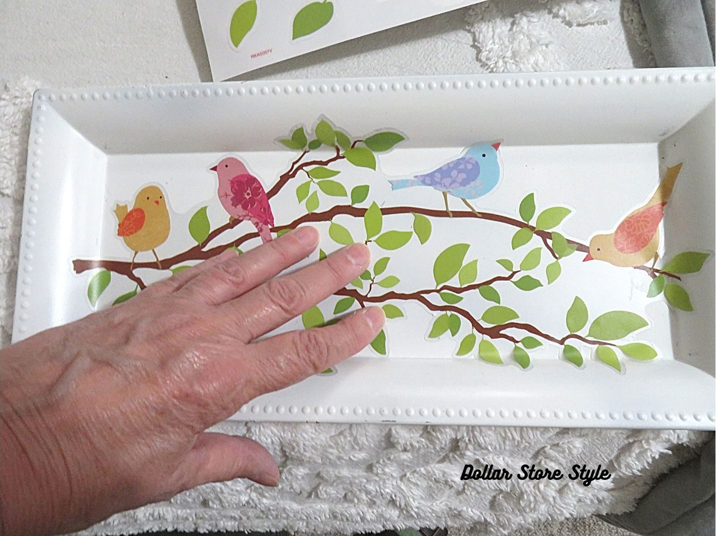 Then, it was a simple matter to remove each long wall sticker and centre them on the charger plates. You can seal the entire piece with Mod Podge but I didn’t think it was necessary. Besides, sometime down the road, I may want to reuse these chargers for another project.