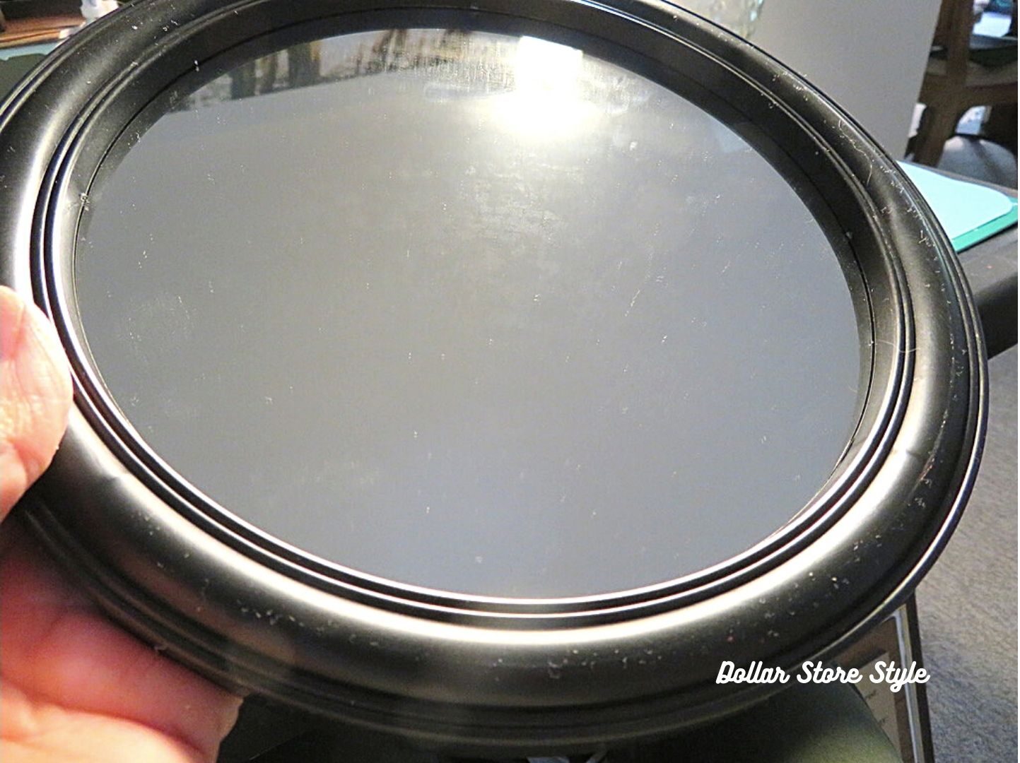 Then it’s a simple matter to apply a bit of Gorilla Glue to the back of the mirror and attach it to the centre of the charger. This is the point where others will add some trim around the edge of the mirror to fill in the gap between the mirror and the raised rim. I preferred to let the gold from the base of the charger plate act as the border, instead.