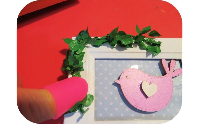 I had some wired vine in my crafting stash and cut a piece to wrap around the left-hand corner of the frame, adding hot glue at the corner and on both ends.