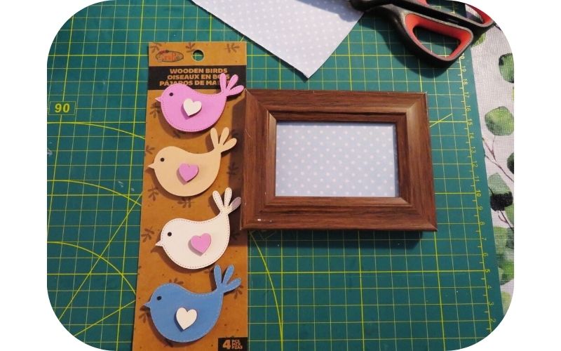 These small frames are readily available at Dollar Tree. I think I found the wood birds at Dollarama, but you can use any spring-themed piece that will fit into the frame. After I’d put a piece of scrapbook paper from my stash into the frame, I realized that the frame didn’t match with the spring vibe I was going for.