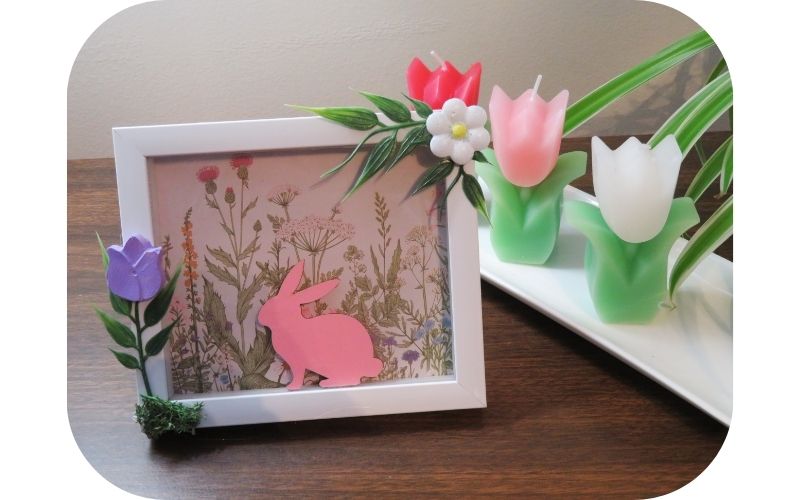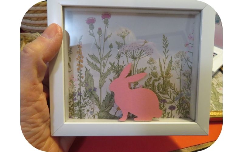 While the wood bunny looks like it’s attached to the glass, I actually decided to hot glue it to the wood ridge inside the frame. Only the bunny’s feet have been glued, which will make it easy to repurpose the frame at a later time, should I want to.