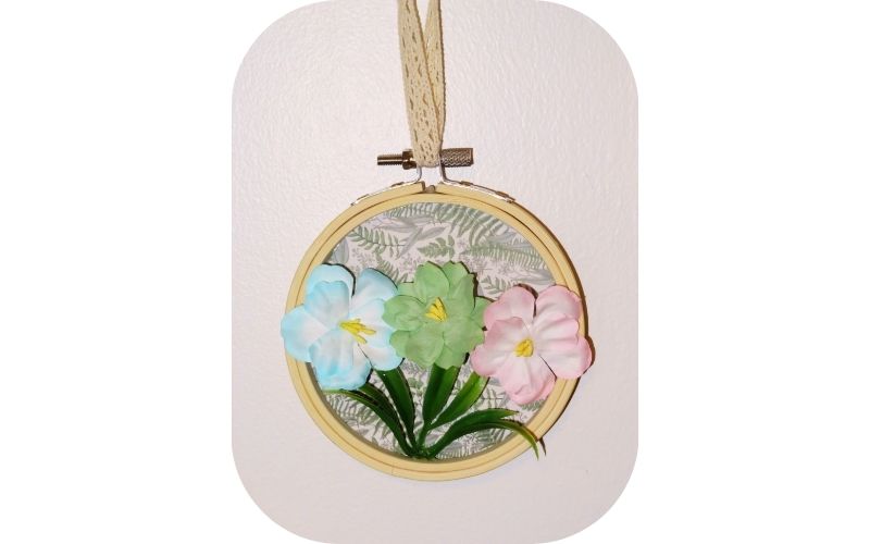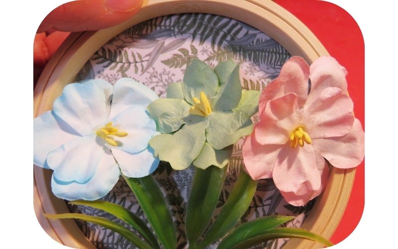 I’m really happy with the spring vibe this little frame evokes. The paper flowers put me in mind of morning glories.
