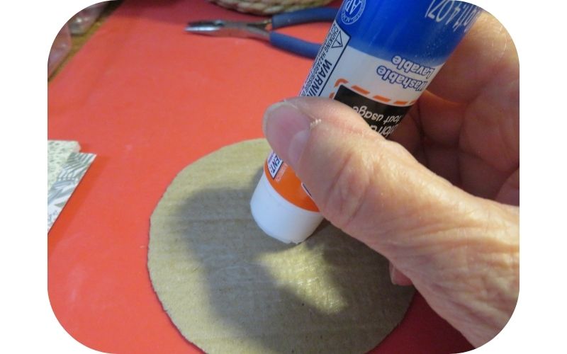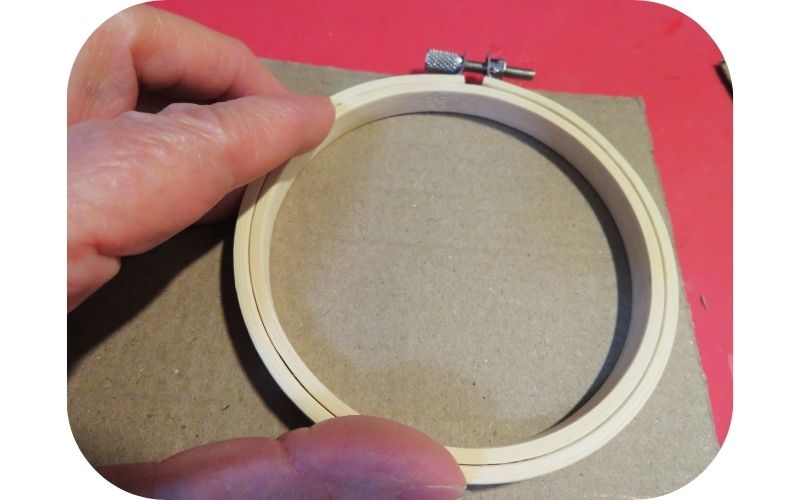 I had this 4″ embroidery hoop left over from a package of three different sizes. To make it into a frame, I started by cutting a piece of light cardboard to size. I like to save the cardboard inserts that come with new calendars for things like this.