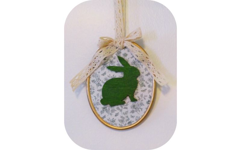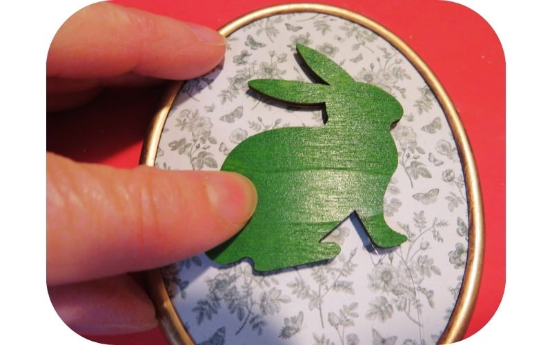 I again used one of the coloured bunnies from my stash, hot gluing it to the middle of the frame. This reminds me of a silhouette, which was very popular in Victorian times. If I wasn’t making this frame for Easter, I would paint the rabbit black to mimic that look.