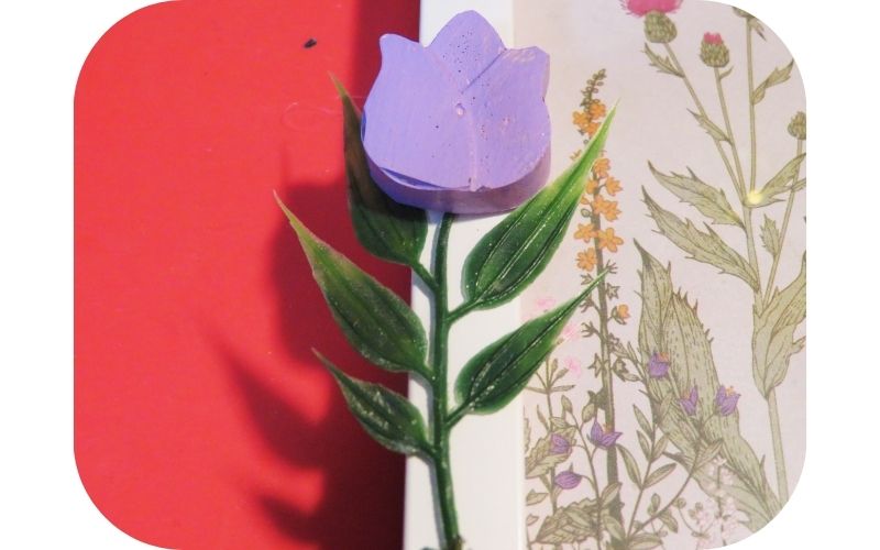 I’ve got a bin where I keep bits and pieces of greenery and I chose a piece to be the stem of the tulip, hot gluing the pieces to the bottom, left-hand side of the frame.