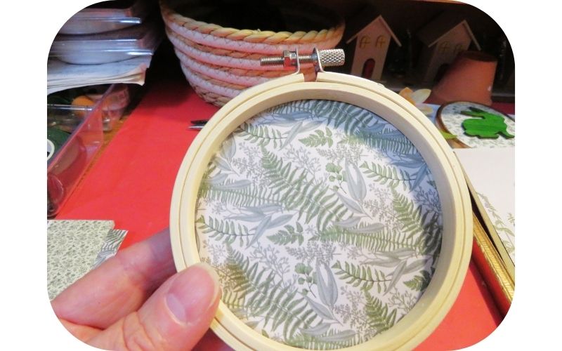 …and glued the backing to the embroidery hoop, trimming any excess cardboard from around the edges. I think you could potentially do this for any size of embroidery hoop.