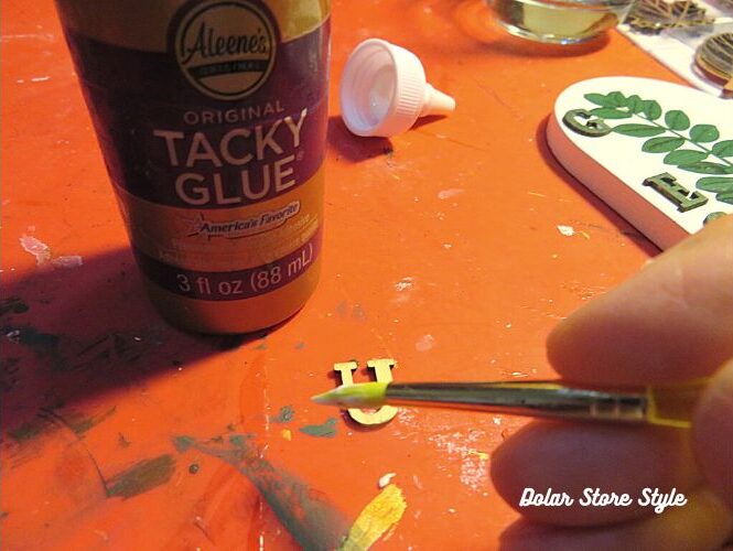 Some tacky glue, applied with a small paint brush, was used to attach the letters to the plaque, one word down each side of the leaf.