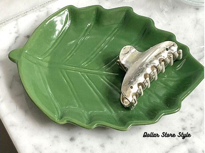 Trinket trays can always be found at Dollar Tree. I happened upon this leaf-shaped one recently and grabbed it up for my bathroom to hold smaller items like hair clips.