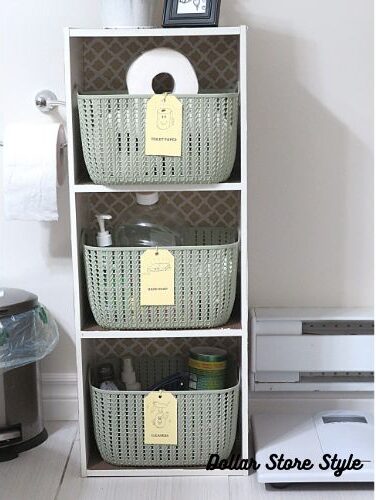 I have had a narrow 3-shelf unit for some time. I gave up looking for square bins that would fit it and opted instead for these mint green plastic baskets, which, as it turns out, I like better. These were found at Dollarama but I’ve seen similar plastic baskets at Dollar Tree if you need them. Each handled basket is 11 inches long by 7 inches wide.