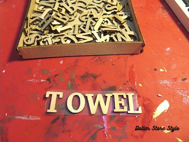 As my one bathroom would necessarily need to be shared with visitors, I added some tiny wood letters to one of the wood plaques to indicate the guest hand towel. Here’s how I did that:
