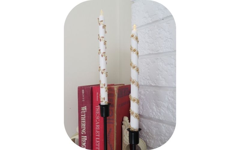Dress up some plain white LED candles with long strips of beaded stickers. It’s so easy to do and turns the ordinary into something more high-end.